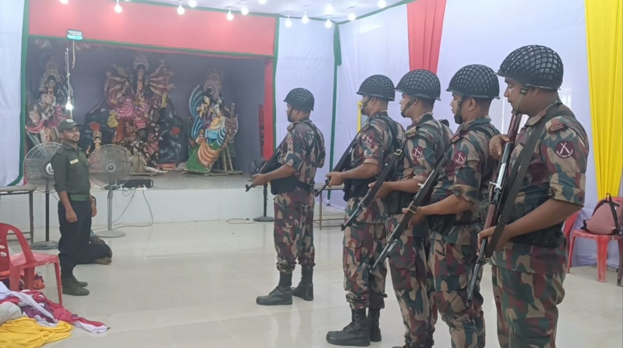 গোলাম মোস্তাফিজার রহমান মিলন, হিলি( দিনাজপুর) প্রতিনিধি:-দিনাজপুরের হিলিসহ আশপাশের সীমান্তবর্তী উপজেলার পূজা মণ্ডপের নিরাপত্তা নিশ্চিতে টহল শুরু করেছে বিজিবি সদস্যরা। শনিবার দুপুর হিলি চন্ডিপুর সার্বজনীন মন্দির থেকে টহল কার্যক্রম শুরু করে জয়পুরহাট ২০-বিজিবির সদস্যরা।দুপুরে মুঠোফোনে বিষয়টি নিশ্চিত করেছেন জয়পুরহাট-২০ ব্যাটালিয়নের ভারপ্রাপ্ত অধিনায়ক মেজর কাজী আসিফ আহমদ। তিনি বলেন, হিন্দু সম্প্রদায়ের সবচেয়ে বড় ধর্মীয় উৎসব শারদীয় দূর্গা পূজা উপলক্ষে সীমান্তবর্তী এলাকার পূজা মণ্ডপের নিরাপত্তা নিশ্চিতে কাজ করে যাচ্ছে বিজিবি সদস্যরা। আমাদের ব্যাটালিয়নের সদস্যরা ২৪ ঘন্টা মণ্ডপ গুলোতে টহল দিবে এছাড়াও গোয়েন্দা নজরদারি রাখা হয়েছে পূজা মণ্ডপ গুলো। অপ্রীতিকর ঘটনা না ঘটে সেজন্য আমরা সর্বোচ্চ নিরাপত্তা ব্যবস্থা নিয়েছি।